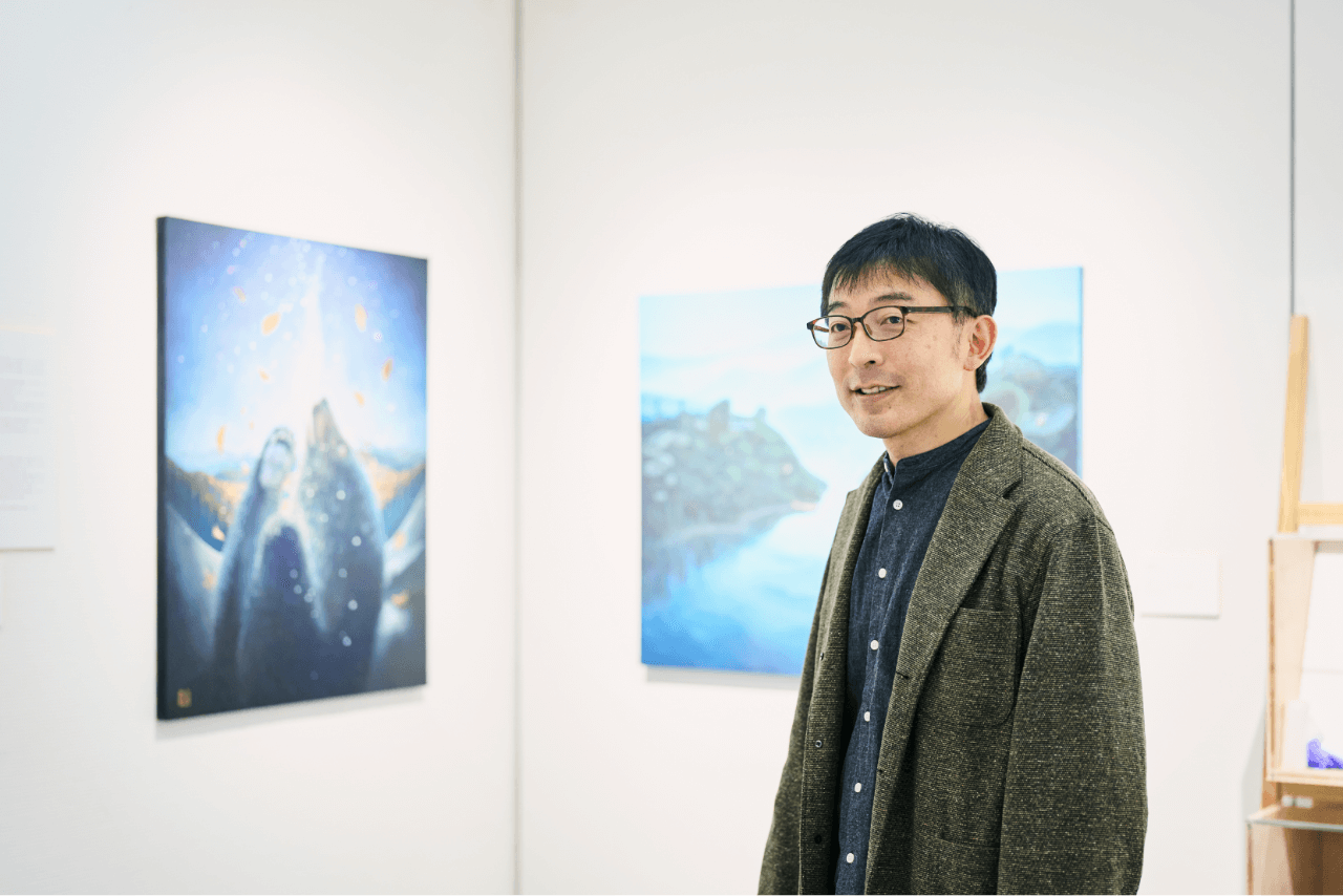 永沢碧衣さんは、僕が秋田公立美術大学に着任した最初の年に教えた学生の一人です。彼女は僕の持っていたマタギの本を読んで熊や狩猟に関心をもったようで、卒業後に阿仁マタギに弟子入りをしました。実際にマタギの狩猟方法にそって、山で捕らえた熊の肉をいただいて、毛皮で“にかわ”を作って、画材にしています。動物を絵のモチーフとしてだけではなくて、自然から授かる“素材”として受け止めてもいるんですね。また、彼女は熊という動物に対して人間社会が抱えている矛盾を引き受けながら描いている。阿仁地域のマタギ集団では、熊を山の神様から授かり、魂を山に返して肉をいただく儀式をします。一方で彼女が住んでいる秋田県南では、熊が里に降りれば、猟友会の一員として駆除しないといけない。神獣としての熊と、害獣としての熊という相反する世界に引き裂かれながらも、動物の命を受け止めて、自分なりのモチーフにして描いているんです