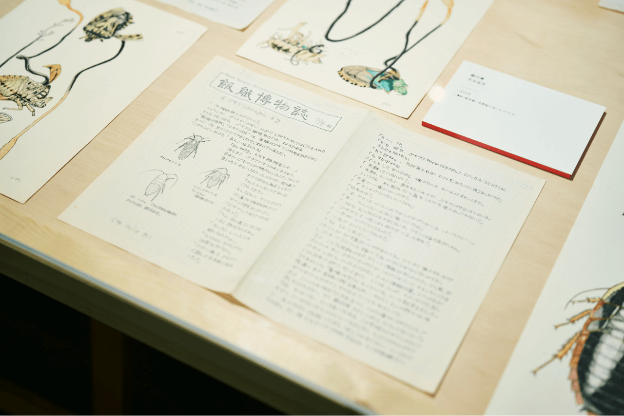さまざまなゴキブリを精密に描いた美しい絵があります(笑)。私はこちらの生物を観察して描く博物誌的なパートが、今回の展示の中でもすごく重要だと思っています。盛口さんは、博物学者として著名で、ゲッチョ先生と呼ばれています